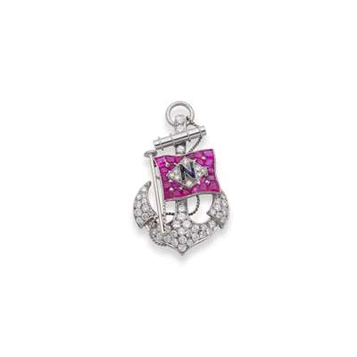 Modelled as a ship's anchor, set throughout with brilliant-cut diamonds, overlaid by a square step and triangular-cut ruby flag, featuring a calibré-cut sapphire 'N' on a field of single-cut diamonds, diamonds approx. 1.65 carats total, length 4.7cm