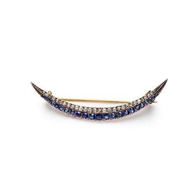 The elongated crescent moon set with lines of circular and oval-cut sapphires and old brilliant-cut diamonds, diamonds approx. 0.75 carat total, later brooch fitting, length 6.4cm, fitted case
