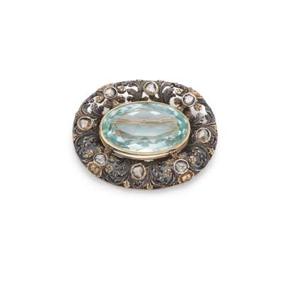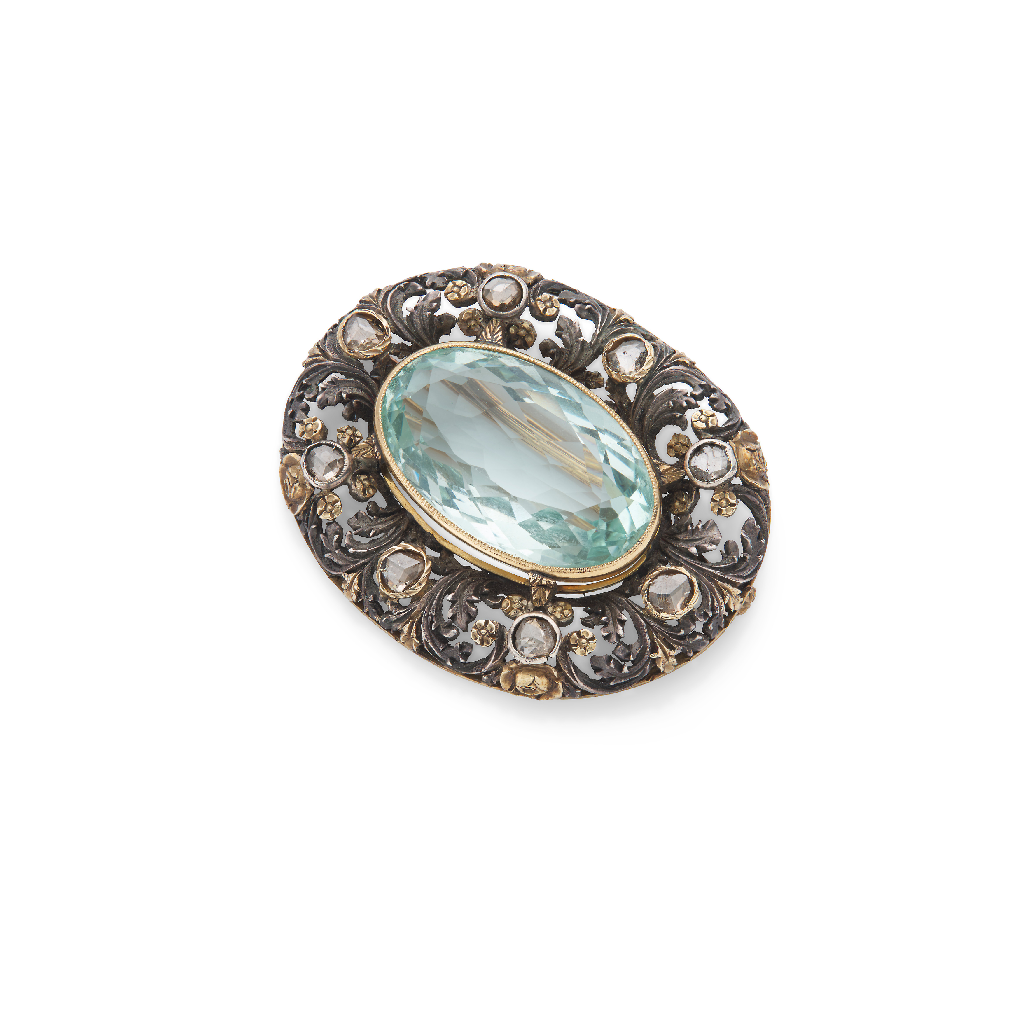 The collet-set oval-cut aquamarine, within a bi-coloured floral setting accented by rose-cut diamonds, aquamarine approx. 20.55 carats, length 4.3cm