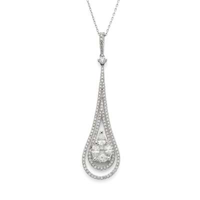 Centrally set with a cluster of princess, marquise-cut and pear-shaped diamonds within a teardrop shaped pendant set with brilliant-cut diamonds, to an 18 carat white gold trace-link chain, diamonds approx. 1.55 carats total, partial London hallmarks, lengths: pendant 5.7cm, chain 40.7cm