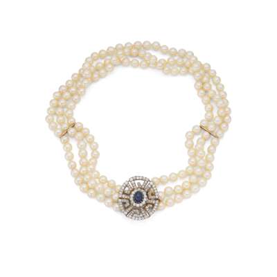 The rows of 6.5mm - 6.8mm cultured pearls, to an oval clasp of pierced Greek key design, set with cushion-shaped and old brilliant-cut diamonds, surrounding a central oval cabochon sapphire, diamonds approx. 3.25 carats total, length of shortest strand 41.3cm