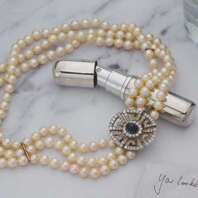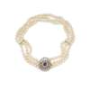 A triple-strand cultured pearl necklace with a sapphire and diamond clasp