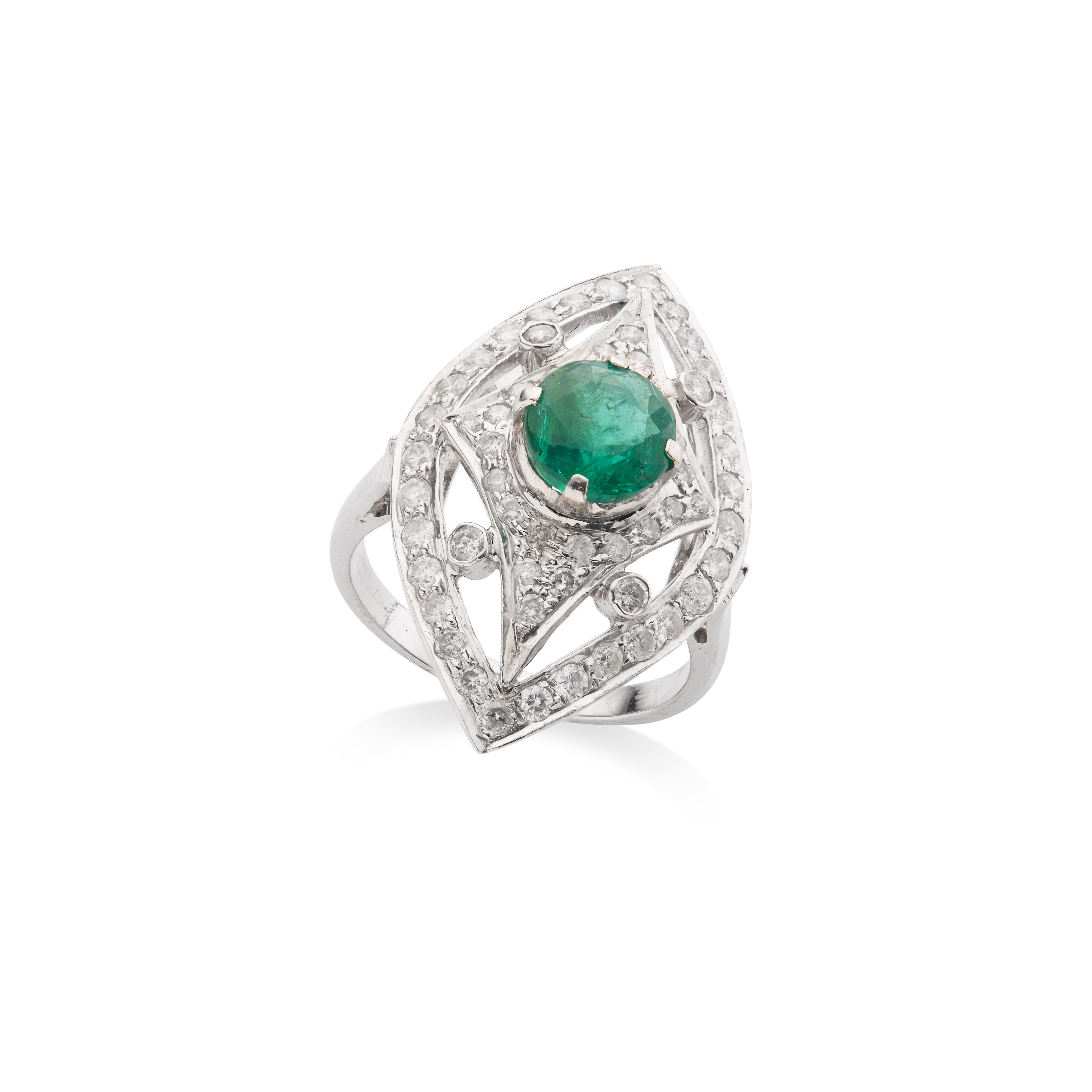 The openwork navette plaque set throughout with brilliant-cut diamonds, centrally featuring a circular-cut emerald, diamonds approx. 1.05 carats total, emerald approx. 1.45 carats, ring size O