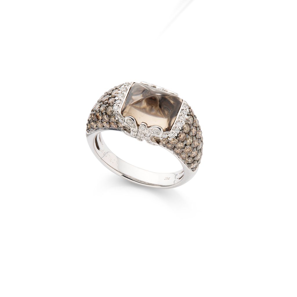 The sugarloaf smoky quartz, within a brilliant-cut diamond surround and scrolling motifs, between tapering shoulders set with similarly-cut diamonds of brown tint, diamonds approx. 2.30 carats total, signed Korloff, French assay mark, ring size N½