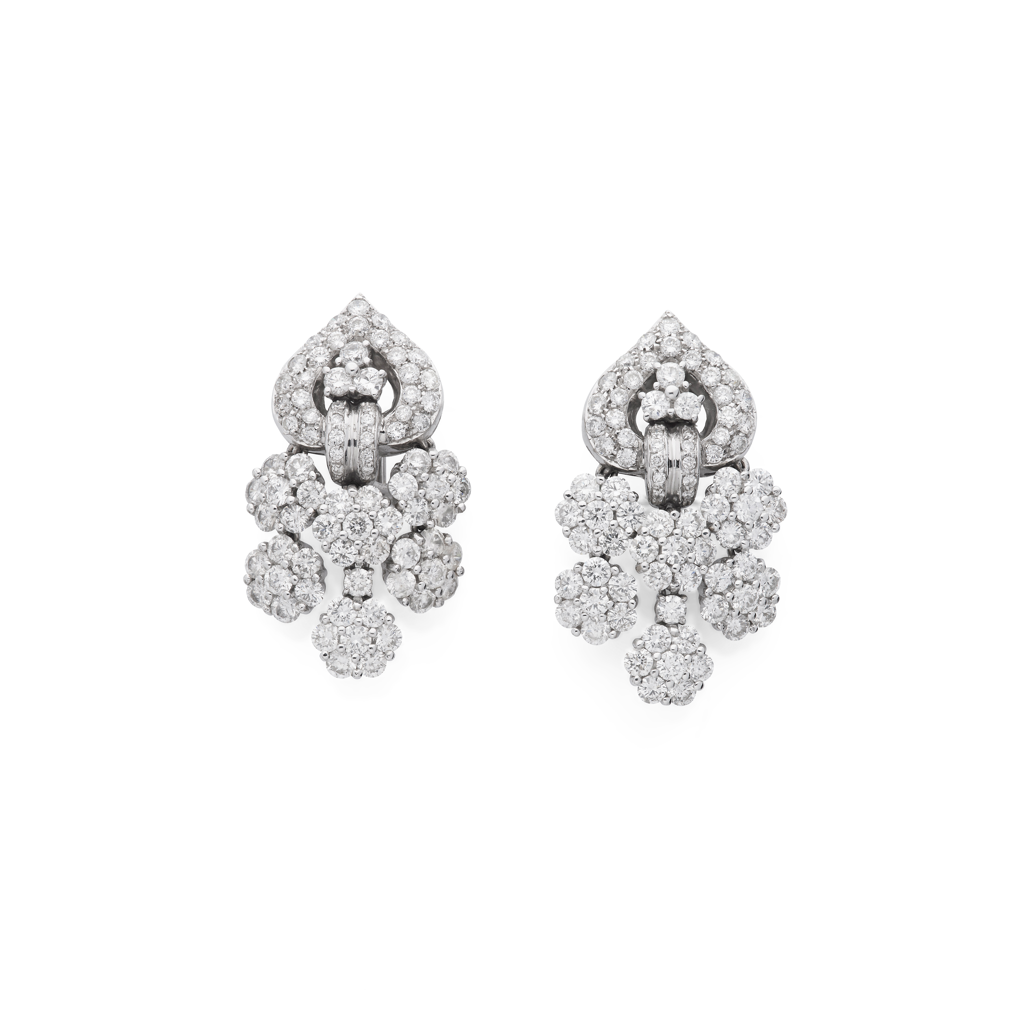 Each of girandole design, the pear-shaped surmount set with brilliant-cut diamonds, suspending three drops set with floral clusters of similarly-cut diamonds, diamonds approx. 13.70 carats total, maker's mark M, post and clip fittings, length 4.0cm