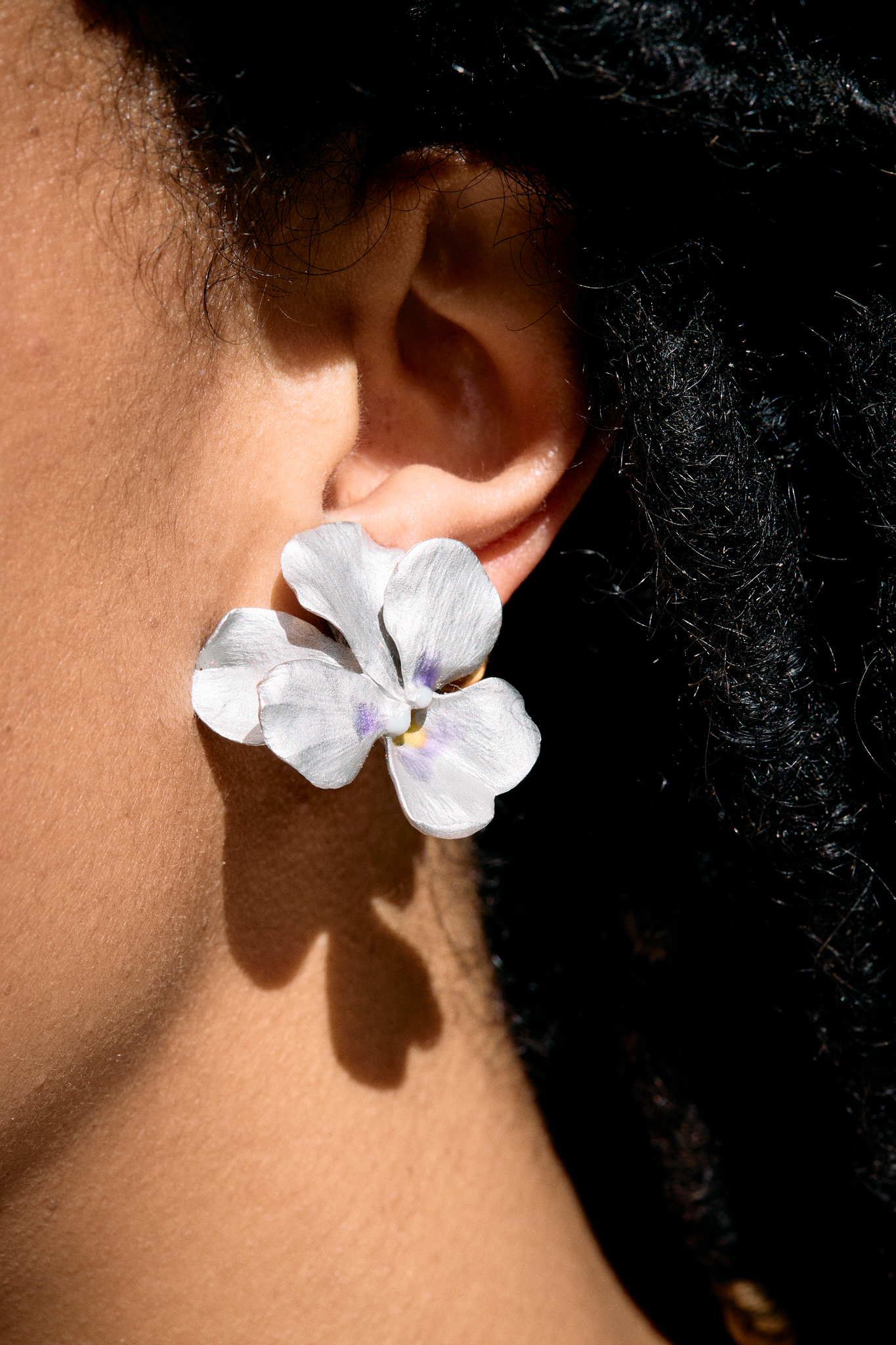 Each anodised aluminium silver pansy, with a central lavender and yellow highlight, signed JAR, clip fittings, length 3.3cm, maker's pouch