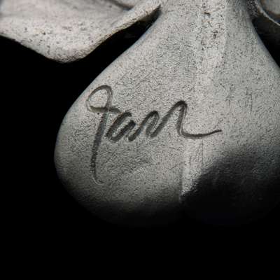 Guests of the exhibition toured rooms in complete darkness making their way with a torch in hand. To view the displays, the viewer must literally shine their light on them, making each viewing experience unique and private. A series of four styles of aluminium and gold floral earclips were specially created for the exhibition for purchase. Retailing then at just £250 each. This pair was purchased by the vendor at the exhibition.