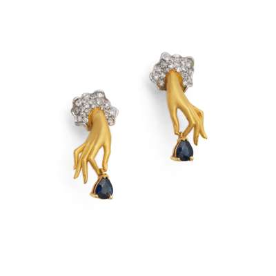 Each realistically modelled as a hand projecting from a brilliant-cut diamond cuff, the fingers grasping a dangling pear-shaped sapphire, diamonds approx. 0.35 carat total, maker's marks CC, numbered, Spanish assay marks, post fittings, length 2.4cm