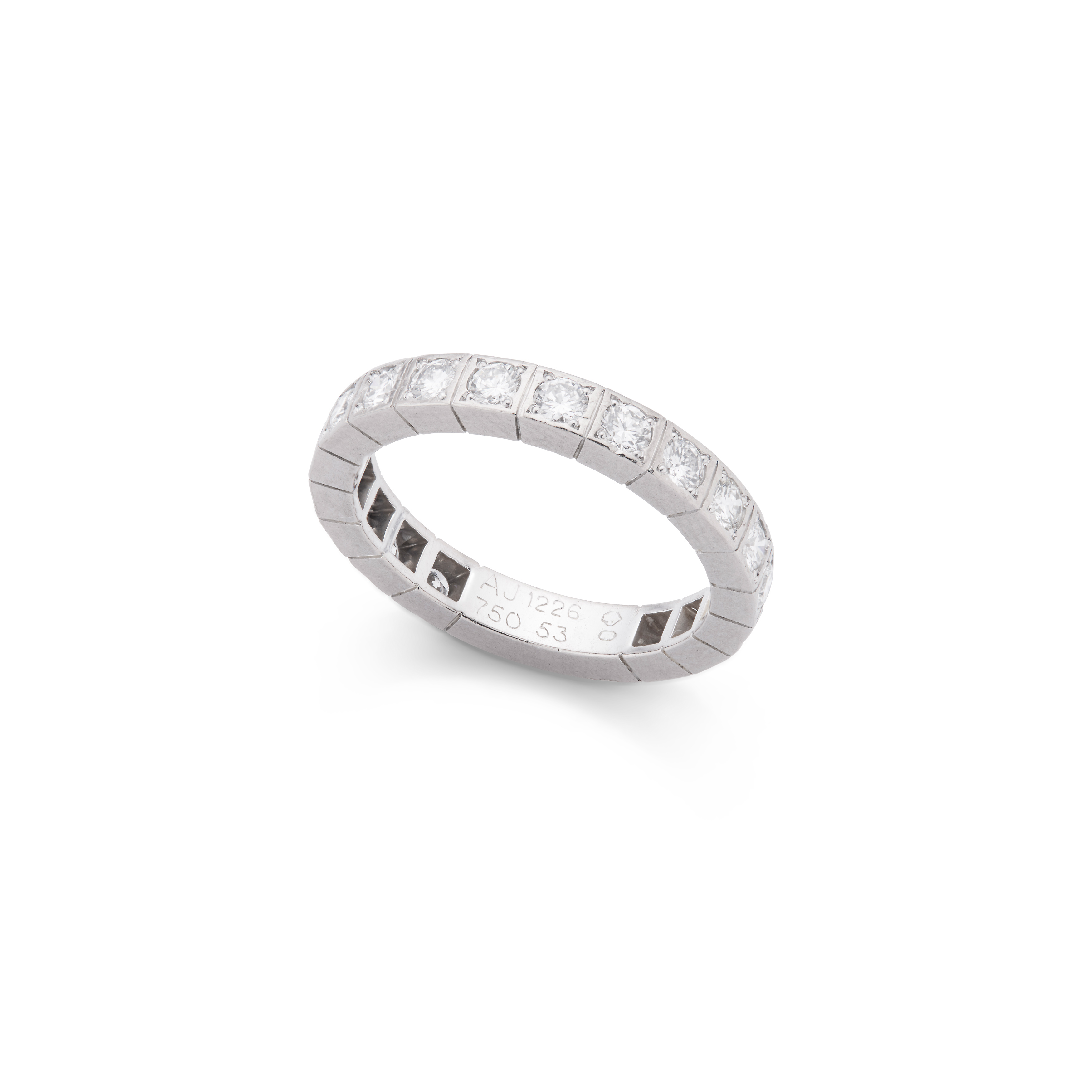 The 18 carat white gold gallery with square segmented details, set throughout with brilliant-cut diamonds, diamonds approx. 1.50 carats total, signed Cartier, numbered, European convention mark, Swiss assay mark, Cartier size 53, maker's case and box