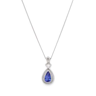 The pear-shaped tanzanite, in a pavé-set brilliant-cut diamond double border and surmount, suspended from an 18 carat white gold trace-link chain, diamonds approx. 0.80 carat total, tanzanite approx. 4.50 carats, partial UK hallmark, European convention mark, lengths: pendant 3.8cm, chain 46.6cm