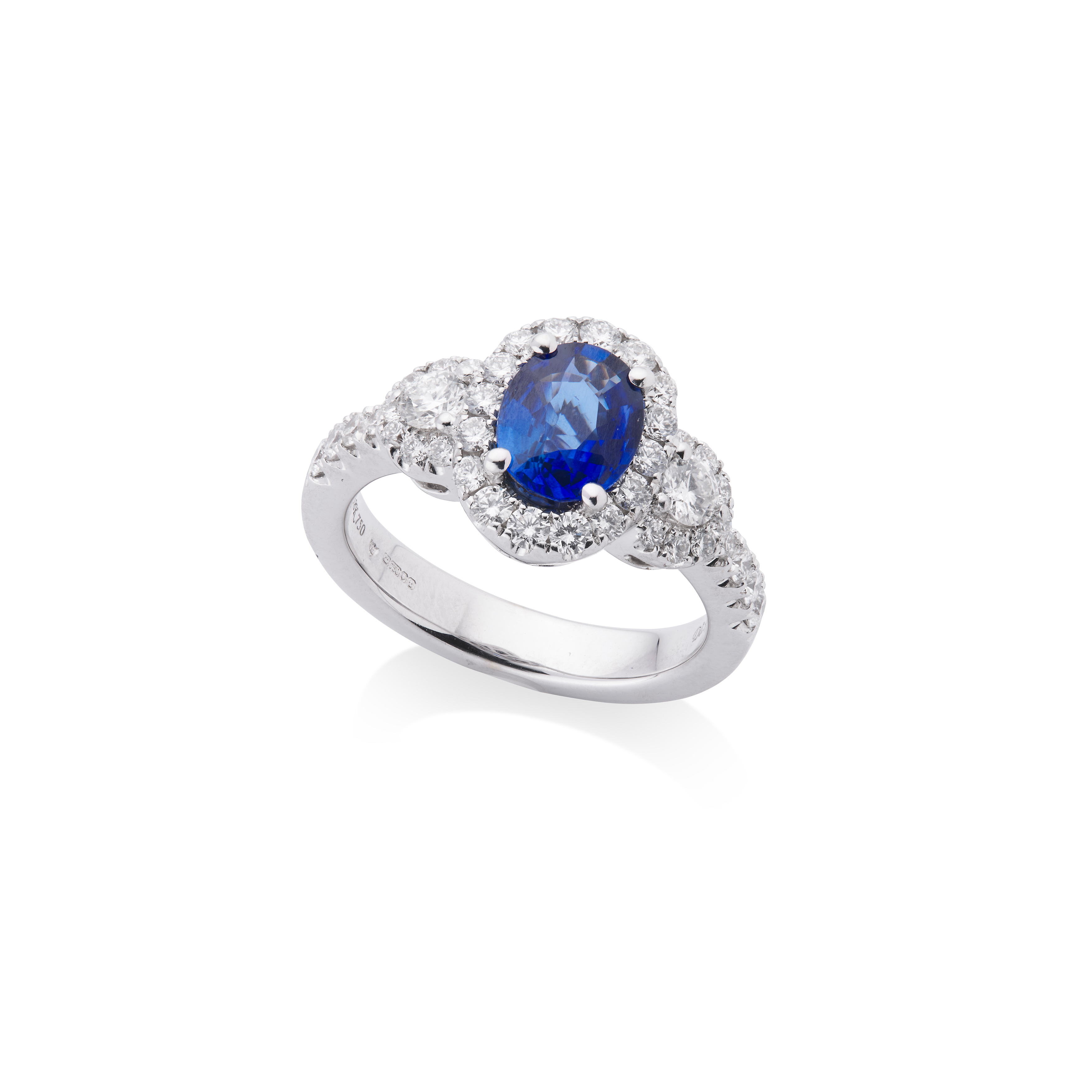 The central oval-cut sapphire, within a triple brilliant-cut diamond cluster design, mounted in 18 carat white gold, diamonds approx. 0.90 carat total, sapphire approx. 1.45 carats, London hallmark, ring size L½