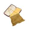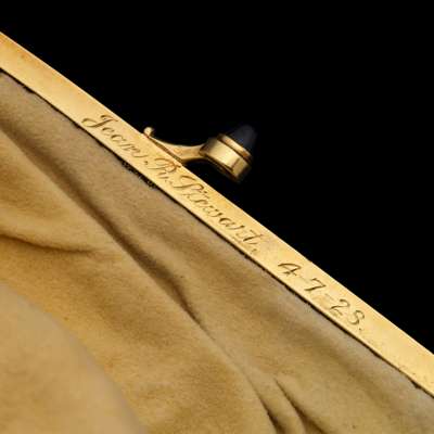 The mesh woven bag with chevron detail, to a rigid frame set with a raised oval cabochon sapphire clasp, the inside frame engraved Jean R. Stewart 4-7-28, suspended from a cable-link strap, signed Boucheron Paris, illegible maker's mark, French assay marks, frame width 11.1cm, Boucheron case