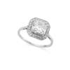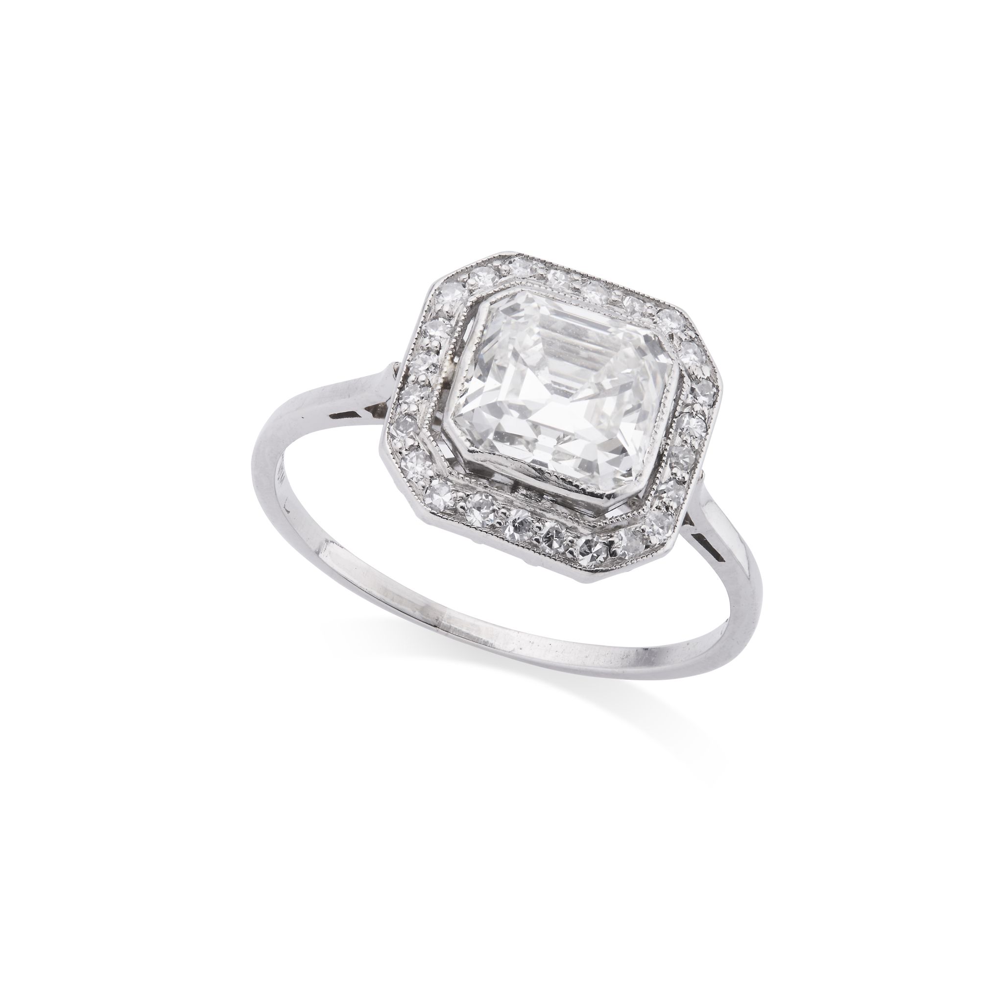 The Asscher-cut diamond, in a millegrain collet-setting, within a pierced surround of single-cut diamonds, numbered, ring size K