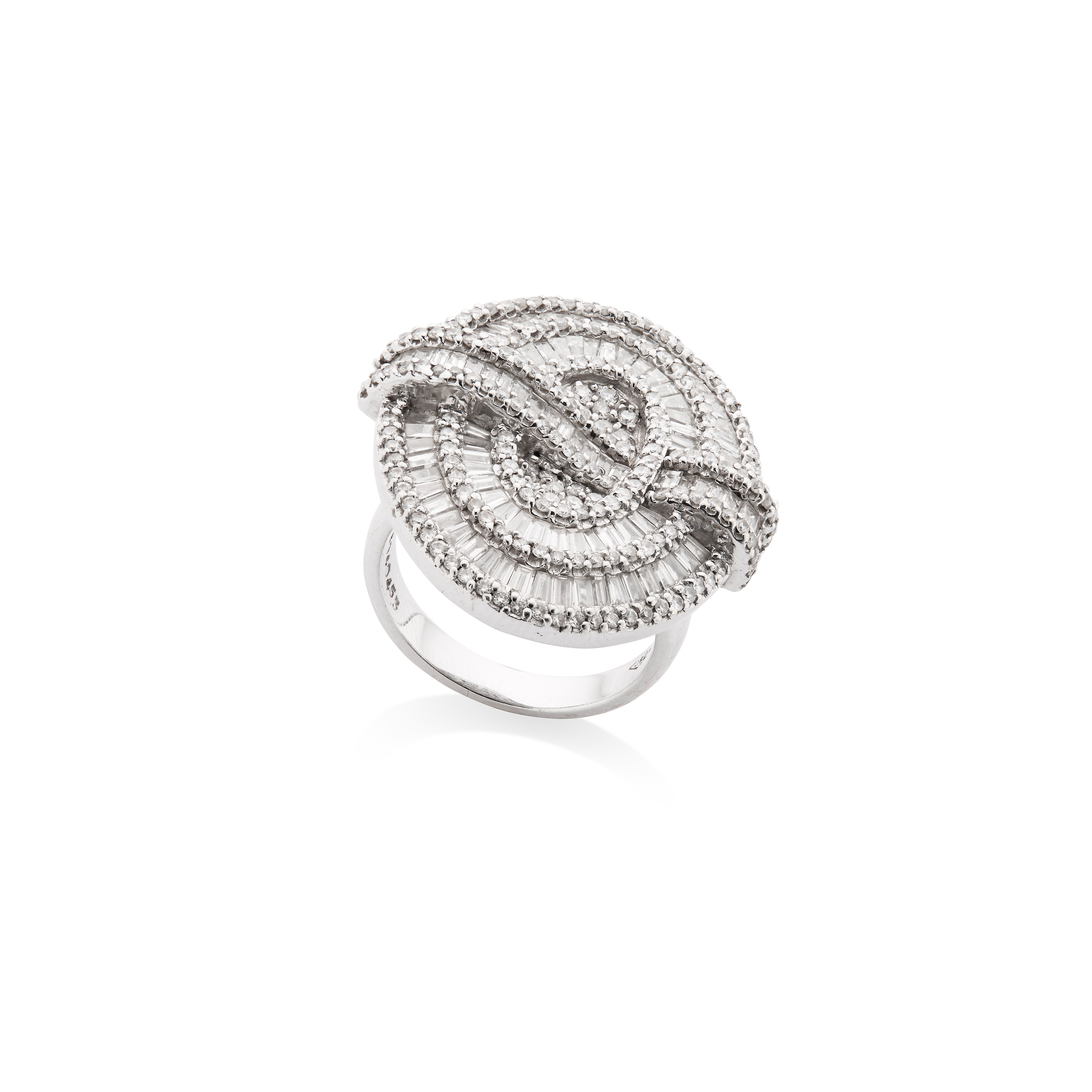 The oval plaque set with multiple frames of baguette and tapered baguette-cut diamonds, between lines of brilliant-cut diamonds, diamonds approx. 2.00 carats total, a few diamonds deficient, ring size N½