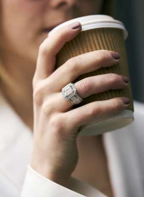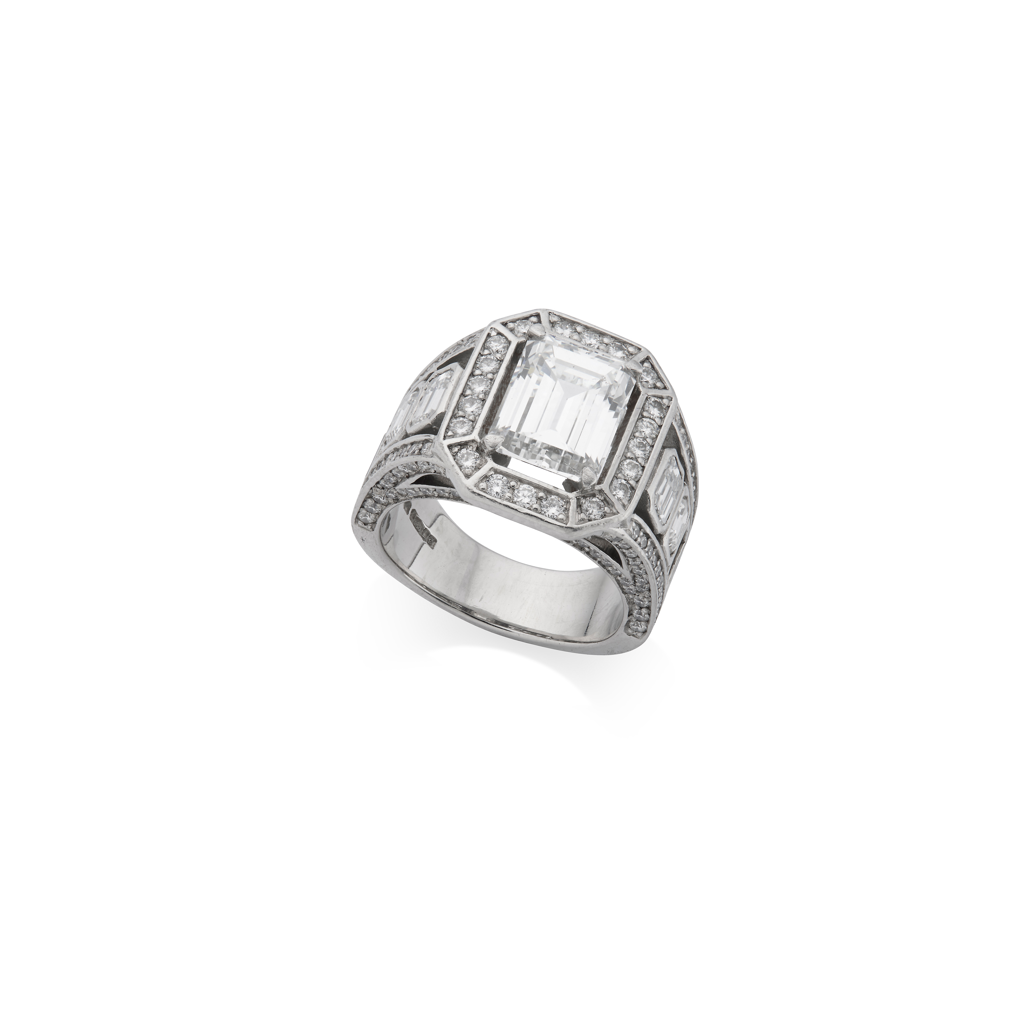 The central step-cut diamond, weighing 2.81 carats, within an octagonal platinum surround of brilliant-cut diamonds, between pierced shoulders of collet-set step and baguette-cut diamonds, to a brilliant-cut diamond gallery, remaining diamonds approx. 2.65 carats total, maker's mark LR, UK hallmark, ring size K
