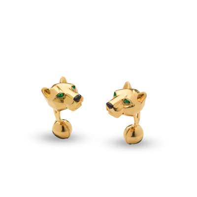 Each terminal realistically modelled as an 18 carat gold panther's head, with marquise-cut tsavorite garnet eyes and an onyx nose, to spherical terminals, signed Cartier, maker's mark JC, French maker's mark, numbered, London hallmark, French assay mark, terminal length 2.7cm