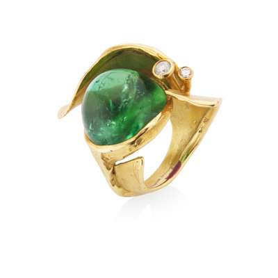 The collet-set circular cabochon green tourmaline, within an abstract flayed design with two collet-set brilliant-cut diamond highlights, indistinct maker's mark, ring size L½