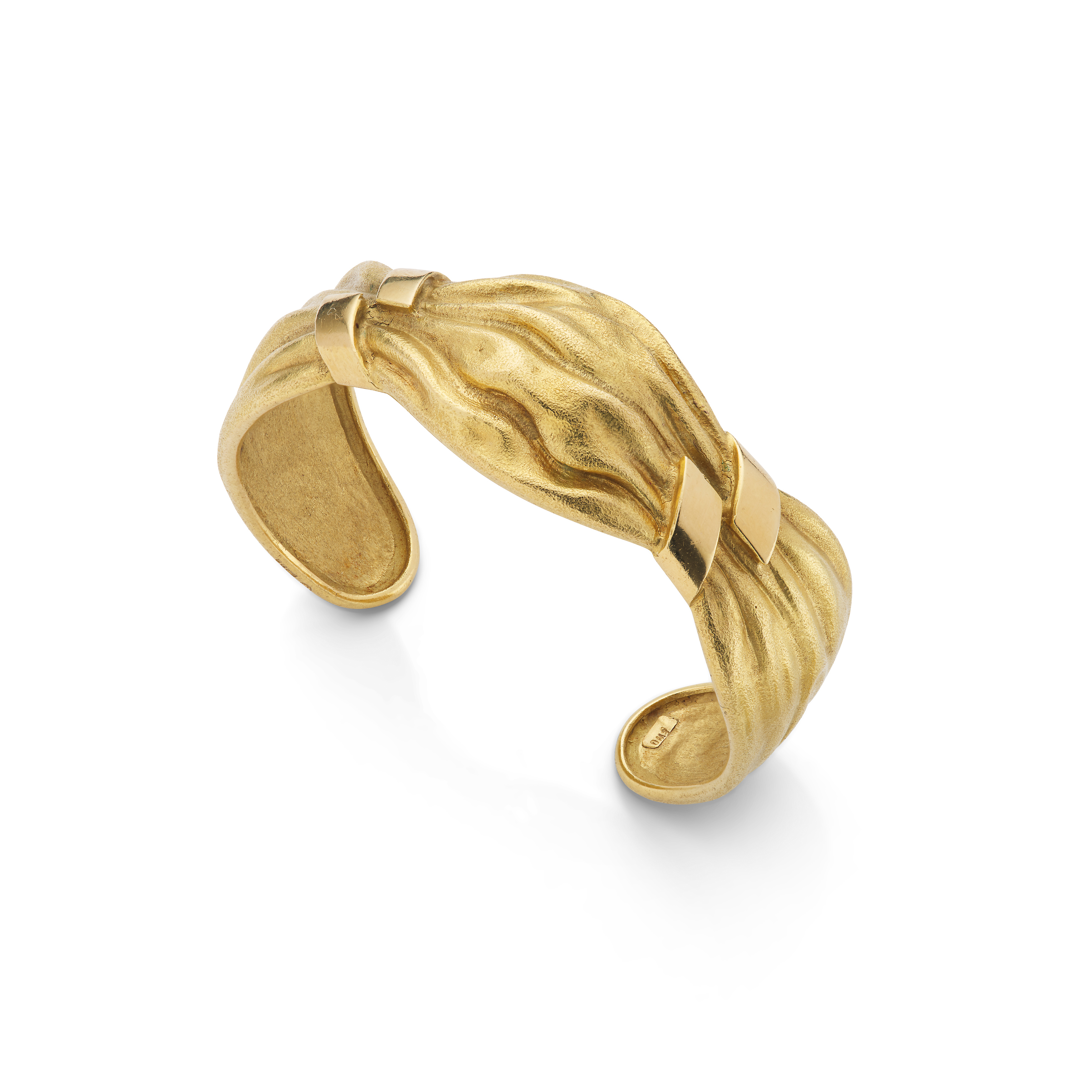 The 18 carat gold cuff, realistically designed as crumpled fabric, with a brushed finish, signed Octavio Sardà, maker's mark S, sponsor's mark SJR, UK import mark, inner diameter 5.3cm