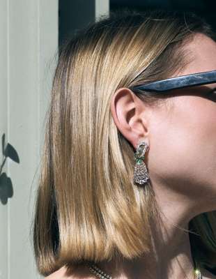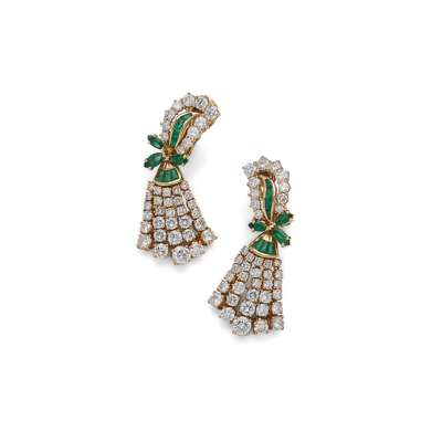 Each openwork surmount of graduated brilliant-cut diamonds framing a line of channel-set calibré-cut emeralds, to a brilliant-cut diamond tassel, spaced by a tapered baguette-cut emerald cap and a trio of marquise-cut emeralds, diamonds approx. 7.50 carats total, unidentified maker's mark, rotating post and clip fittings, length 4.4cm