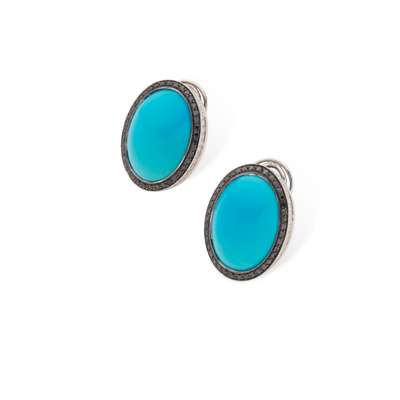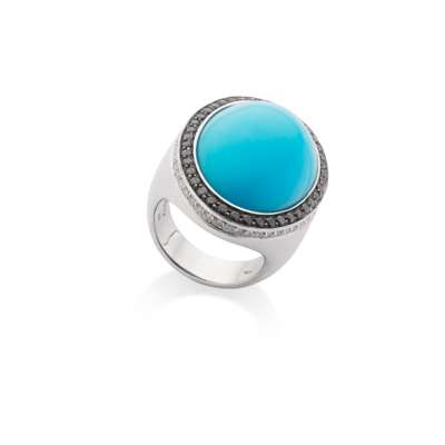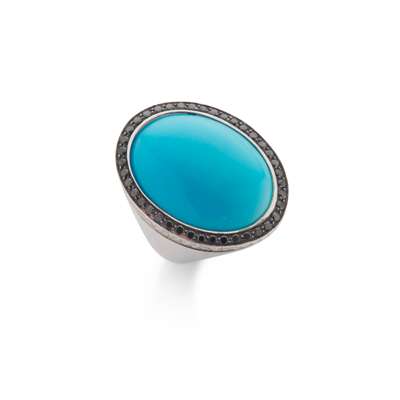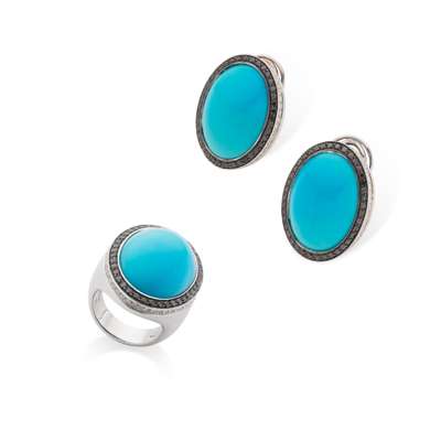 The ring centrally set with an oval cabochon imitation turquoise, within a double surround of circular-cut black diamonds and brilliant-cut diamonds, accompanied by a pair of earrings en suite, brilliant-cut diamonds approx. 2.10 carats total, post fittings, ring size M½, earring length 2.9cm (2)