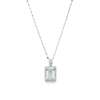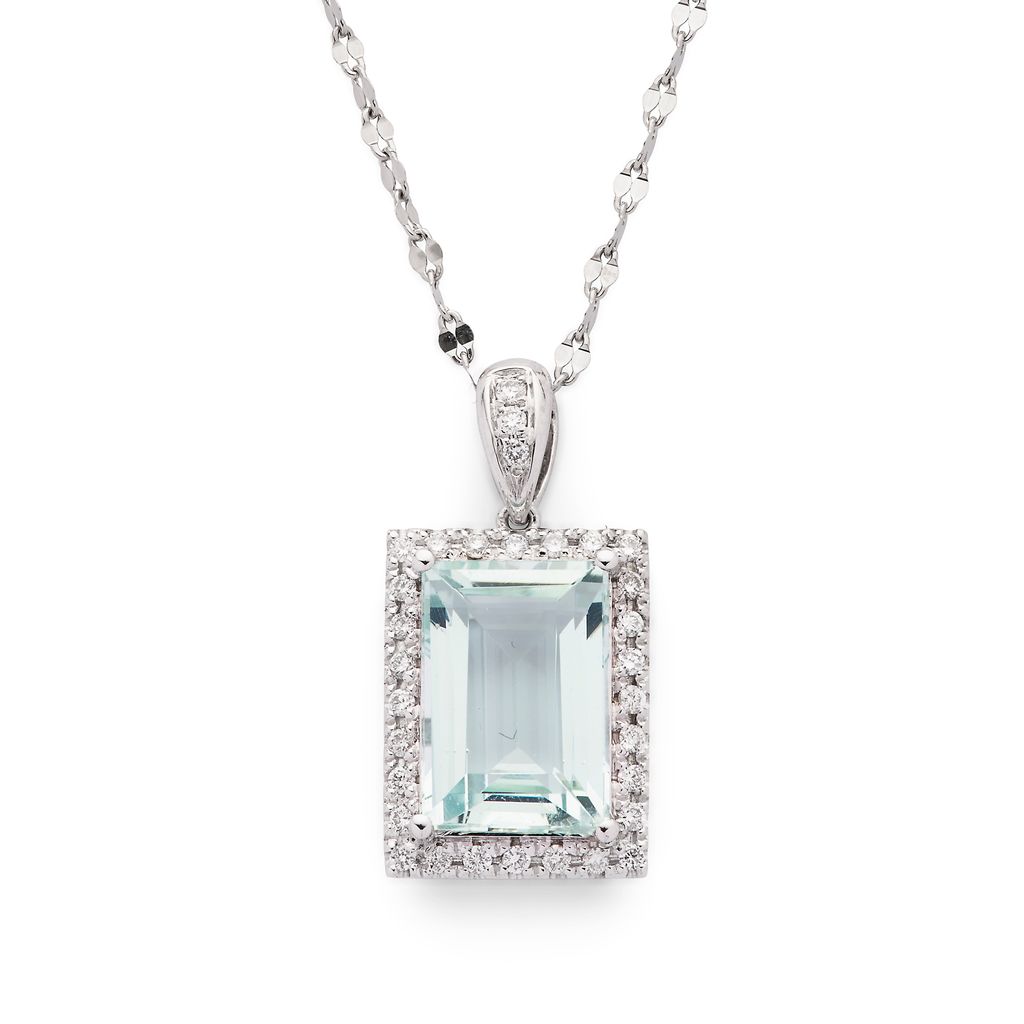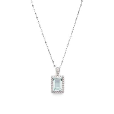 The step-cut aquamarine, in a four-claw setting, within a brilliant-cut diamond frame, suspended from a fancy-link platinum chain, aquamarine approx. 2.70 carats, partial UK hallmarks, chain with European convention mark, lengths: pendant 2.1cm, chain 41.1cm