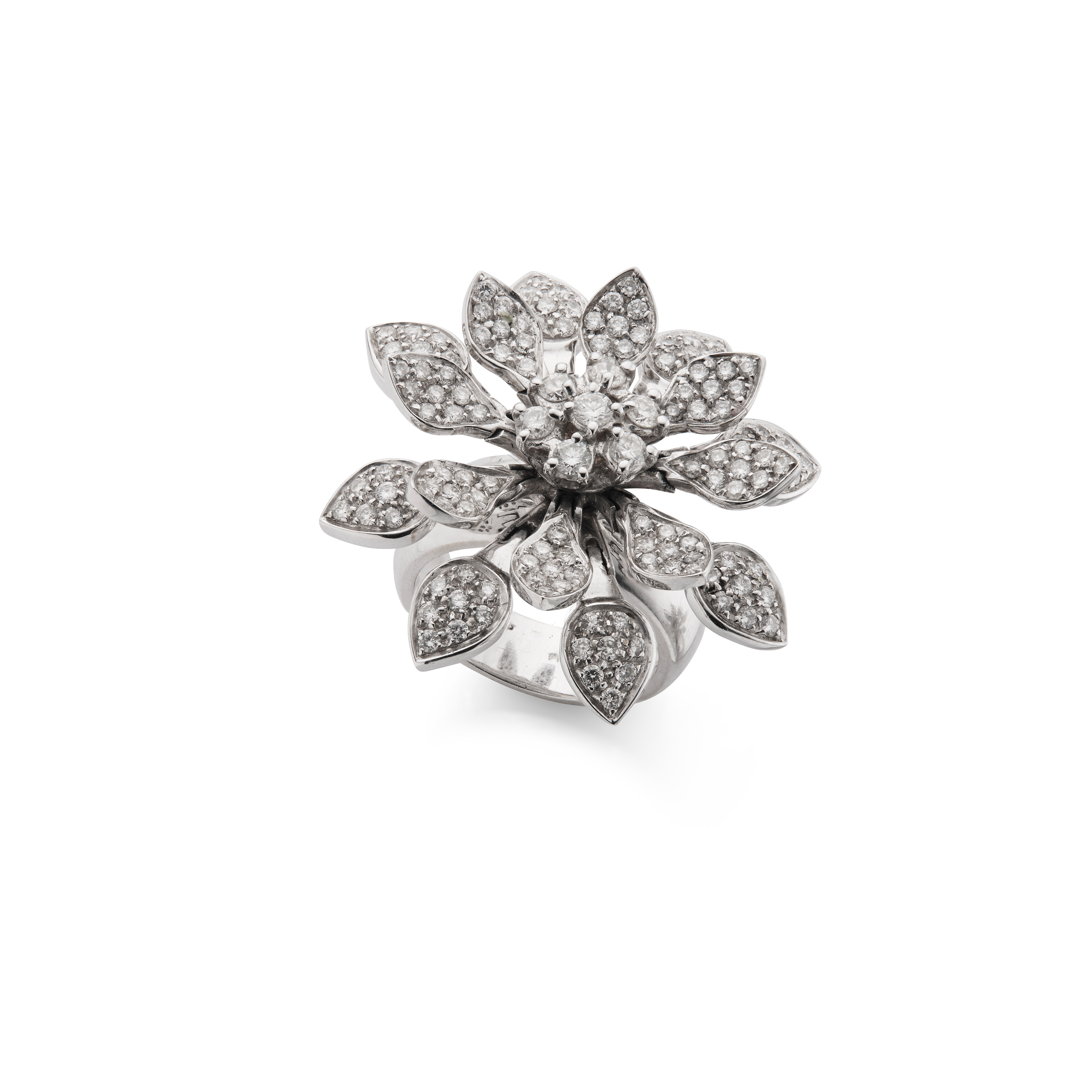 The central cluster of brilliant-cut diamonds, within a moveable surround, each hinged petal set with similarly-cut diamonds, diamonds approx. 3.35 carats total, ring size N