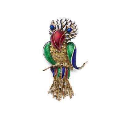 The tufted head of white and royal blue enamel, set with blue enamel eyes with single and brilliant-cut diamond eyebrows, a red guilloché enamelled beak, the body of textured features, with green, white, red and blue enamelled wings and tail feathers, issuing a foxtail-link tassel highlighted by brilliant-cut diamonds, perched upon a single-cut diamond branch, length 10.1cm