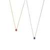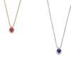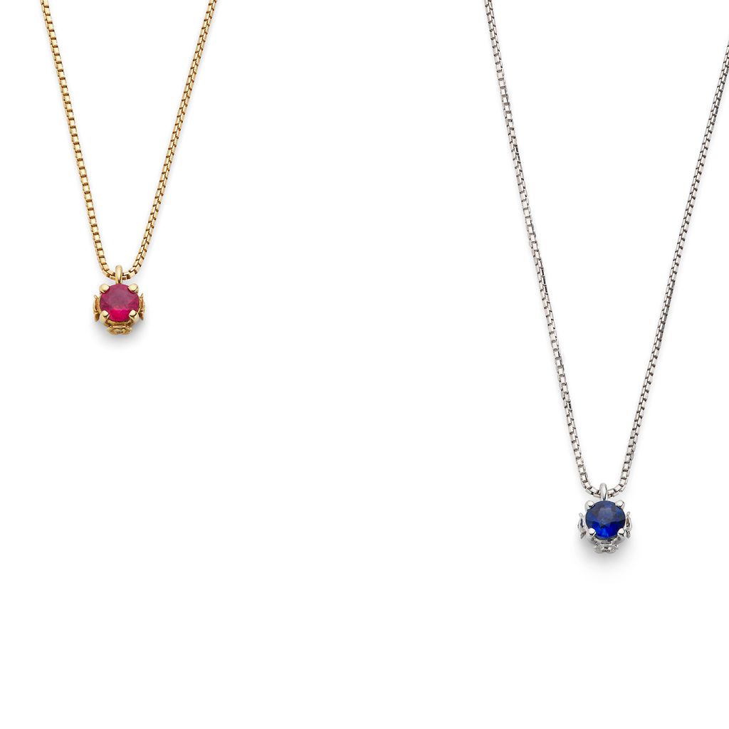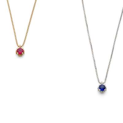 1st: The 18 carat white gold box-link chain suspending a circular-cut sapphire pendant in a four-claw floral setting accented by brilliant-cut diamonds, 2nd: The 18 carat gold box-link chain suspending a circular-cut ruby pendant in a four-claw floral setting accented by brilliant-cut diamonds, maker's logo, maker's marks TF, London hallmarks, lengths: pendants 0.7cm each, chains adjustable 42.2cm - 45.8cm (2)
