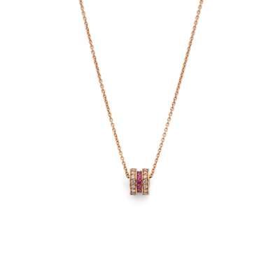 The pendant of barrel design, the central line of circular-cut pink sapphires, between raised courses of brilliant-cut diamonds, suspended from a belcher-link chain, signed Bachet, partially struck maker's marks, numbered, French assay marks, lengths: pendant 0.9cm, chain 41.8cm