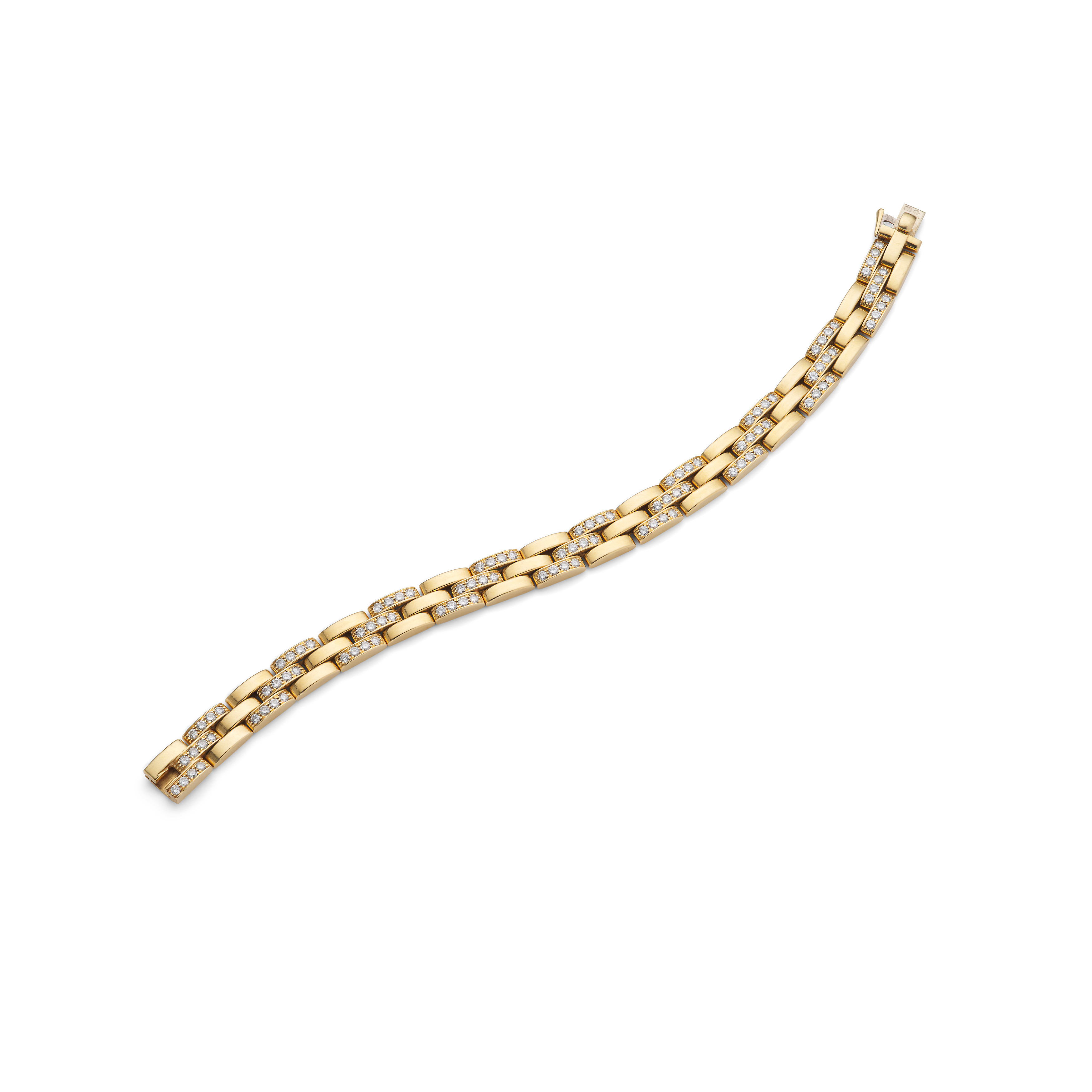 The articulated series of 18 carat gold brick-links, set at intervals with brilliant-cut diamonds, to a concealed clasp, diamonds approx. 3.00 carats total, signed Cartier, maker's mark, numbered, French and Swiss assay marks, European convention mark, length 18.9cm, maker's pouch