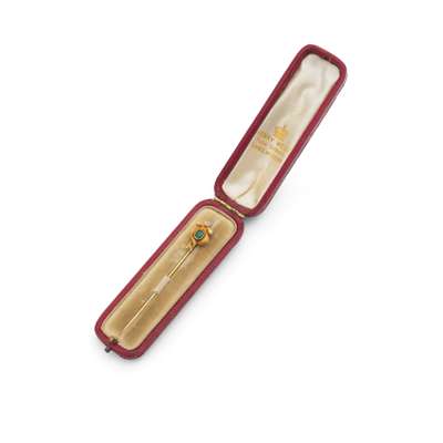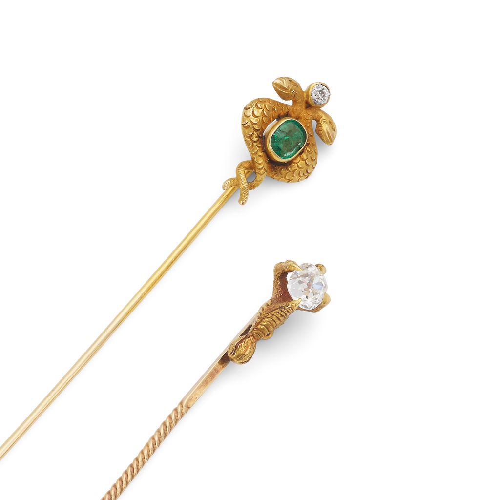 1st: The realistically designed claw clasping a cushion-shaped diamond, diamond approx. 0.60 carat, 2nd: The pair of entwined serpents, supporting a collet-set cushion-shaped emerald, with an old brilliant-cut diamond accent atop, lengths: 6.7cm and 7.2cm, both cased (2)