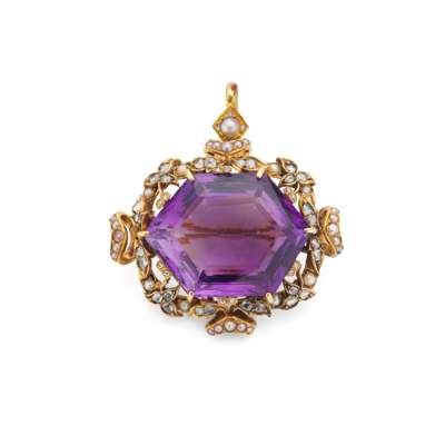 The hexagonal-shaped amethyst, within a floriate surround adorned with half seed pearls and rose-cut diamonds, amethyst approx. 40.40 carats, length 4.4cm