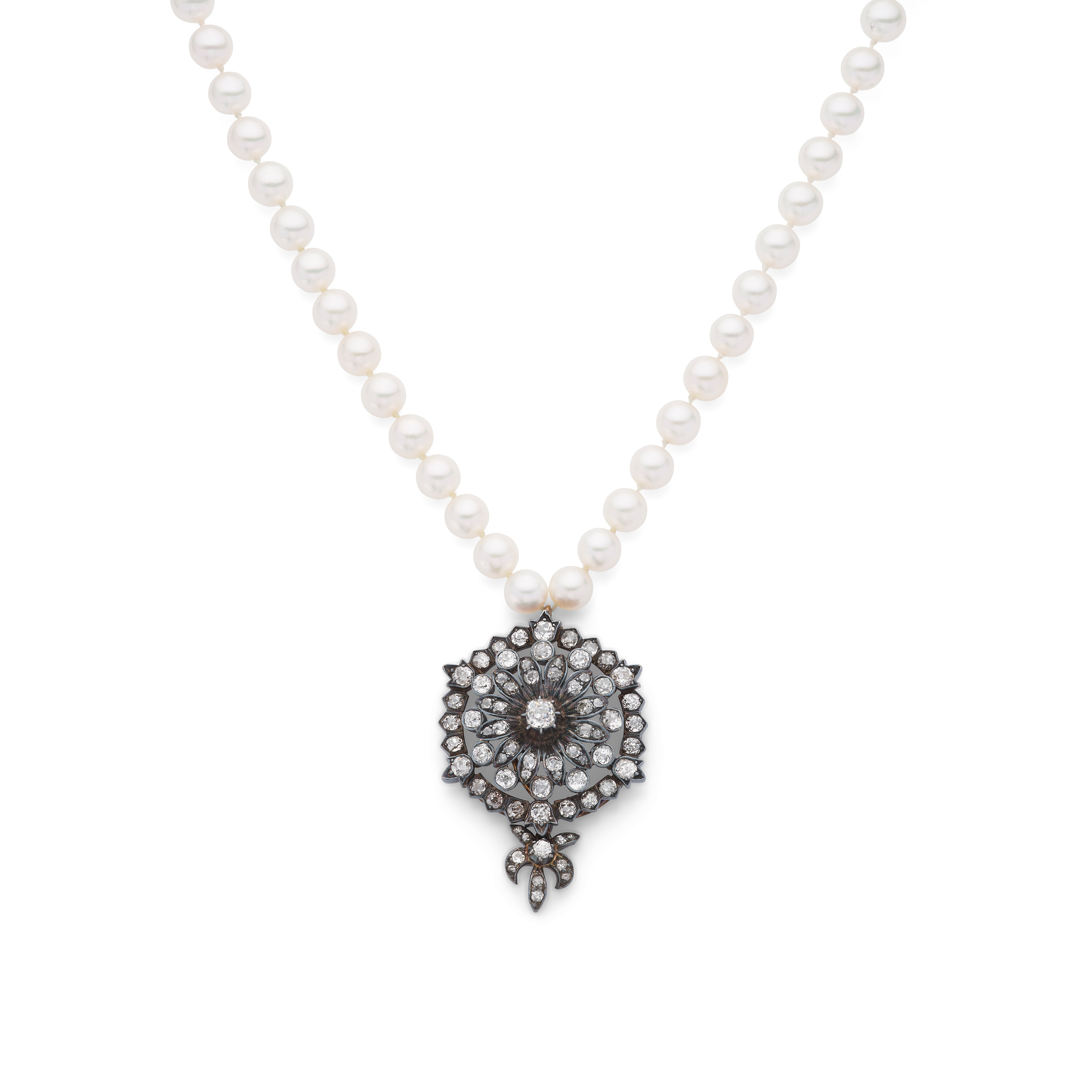 The single strand of 6.4mm-6.8mm cultured pearls, suspending a pierced circular pendant set with cushion-shaped and old-brilliant-cut diamonds, to an 18 carat white gold oval clasp, diamonds approx. 4.55 carats total, clasp with partial London hallmark, lengths: necklace 45.0cm, pendant 4.8cm