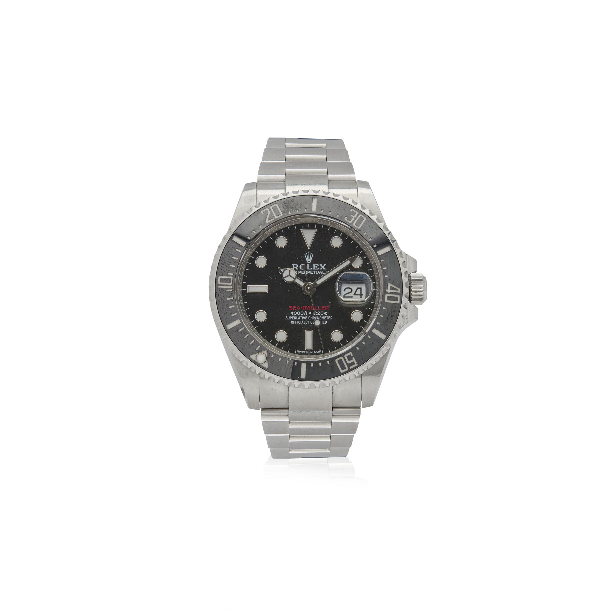 Cal.3235 self-winding movement, glass black dial with luminous dot, triangle and baton indexes within white gold surrounds, SEA-DWELLER in red, date aperture under magnifying lens, sapphire crystal, white gold luminous Mercedes hands, centre seconds, stainless steel case with screw-down reverse, screw-down Oyster Triplock crown, helium escape valve to the band, on fitted stainless steel Rolex Oyster bracelet with Oysterlock clasp featuring quick-adjustment Glidlock and extension. Case, dial and movement signed.
