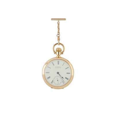 Heavily decorated keyless wind movement jewelled to the centre with screwed chatons, overcoil hairspring, fine adjustment, white enamel dial with Roman numerals, subsidiary seconds, 18k gold Waltham hinged case with cuvette engraved ‘Presented to Royal G. Robins by the Foremen in the employ of The Amn Waltham Watch Co, March 1891’. Case, dial and movement signed. With short gold-coloured chain and bar.
