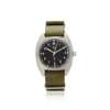 Hand-wound mechanical movement, matt black unsigned dial with broad arrow insignia, tritium designation, one-piece stainless steel tonneau shape case with numbered reverse, solid strap bars, on green NATO style strap. Unsigned, numbered.