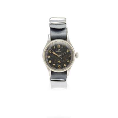 This model was only issued in 1953 and known by collectors as the ‘53TA’, referring to the use of a thin broad arrow on the dial, or ‘53FA’ for the use of a fat arrow. The original radium dials were printed with thin board arrows, but at the request of the British Government, batches of these were returned to Omega to be reprinted with tritium luminescent, the new dials featuring a significantly more prominent ‘fat arrow’.