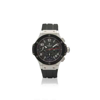 Self-winding movement, black carbon dial with applied alternate steel numerals and batons, date aperture, subsidiary dial for running seconds, 30-minute and 12-hour chronograph registers, stainless steel and titanium case with screwed down glazed reverse, black ceramic bezel secured by special screws, on rubber Hublot strap with Hublot stainless steel folding locking buckle. Case, dial and movement signed.