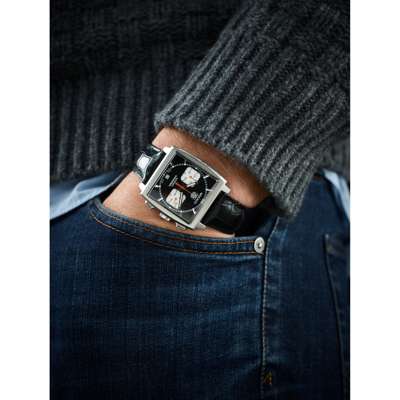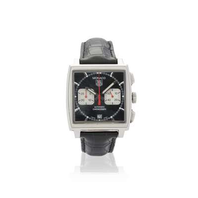 Cal.17 self-winding movement, black dial with square white subsidiary dials for 30 minute chronograph register & running seconds, white minute track with luminous hour dots and outer applied steel faceted baton indexes, steel luminous index hands, red seconds and chronograph hands, square stainless steel case, reverse with limited-edition designation secured by screws , Heuer crown, inset chronograph buttons, on black Tag Heuer strap with stainless steel folding, locking clasp. Case, dial and movement signed.