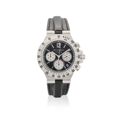 Self-winding 37 jewel movement, black dial with with applied steel baton indexes, silvered subsidiary dials for 30 minute & 12 hour chronograph registers, running seconds, date aperture between 4 & 5 position, steel luminous baton hands, stainless steel case with signed and numbered screw-down reverse, screw-down crown, flat calibrated bezel, on black leather Bulgari strap with associated stainless steel buckle. Case, dial and movement signed.