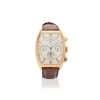 Self-winding movement, silvered ‘sunburst’ dial with outer numerals, inner minute track with red five minutes, subsidiary dials for 30 minute & 12 hour chronograph registers, running seconds, blued steel hands, 18k yellow gold curved tonneau shape case with numbered reverse secured by gold screws, on brown alligator Franck Muller strap with 18k gold Franck Muller pin buckle. Case, dial and movement signed.