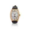 Cal.2800 self-winding movement with platinum weighted rotor, engine-turned ‘sunburst’ silvered dial with black numerals, inner minute with red 5 minute segments track, blue date numerals, date indicator hand, apertures for day, month and moonphases, blued steel hands, curved 18k gold tonneau shape case with inset calendar adjusters, numbered reverse secured by 4 screws, on Franck Muller crocodile strap with 18k gold Franck Muller buckle. Case, dial and movement signed.