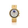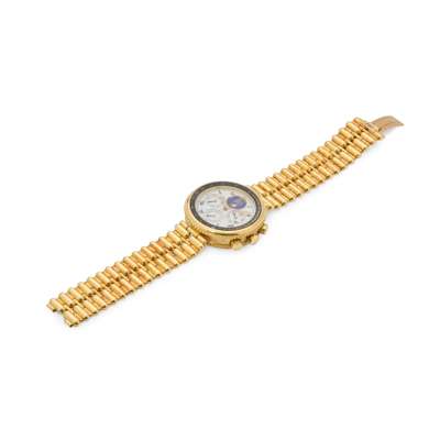 Quartz movement, white dial with black Roman numerals, subsidiary dials for day & 30 minute register, date & running seconds, month & 12 hour register with leap year indicator, lapis lazuli signed AH with aperture for moon phases, outer black tachymeter scale, gold baton hands, 18k yellow gold circular case with reverse secured by gold screws, reeded band numbered 1102 with inset calendar adjusters, on 18k yellow gold Gerald Genta bracelet with clasp sighed AH. Case, dial and movement signed.
