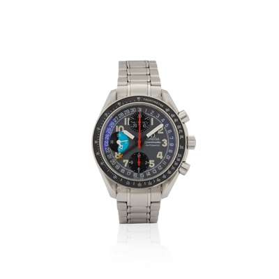 Cal.1151 self-winding movement, grey dial with painted numerals, outer date in white, subsidiary dials for 30 minute and 12 hour chronograph registers, running seconds combined with blue/black 24hr indicator, apertures for day and month, luminous hands, additional orange tipped date indicator hand, stainless steel case with numbered snap-on reverse with central Speedmaster motif, day calendar adjuster to the band, black tachymetre bezel, on fitted stainless steel Omega Ref.1560/852 bracelet with locking clasp. Case, dial and movement signed.