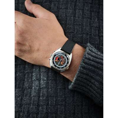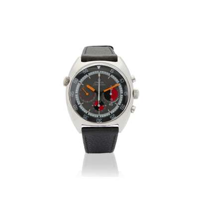 Cal.861 hand-wound movement, grey dial with tritium baton markers, outer white/black grid pattern minute track, red/black subsidiary dials for 30/45 minute & 12 hour chronograph registers, running seconds dial with orange hand, black/orange/tritium hands, white chronograph hands, outer raised revolving rehaut calibrated to 60 minutes, hexalite crystal with central Omega logo, stainless steel tonneau shape case with screw-down reverse with central Seamaster motif, Omega crowns, crown at 10 positions rotates inner 60 minute counter, on period correct Omega leather strap with stainless steel Omega pin buckle. Case, dial and movement signed.