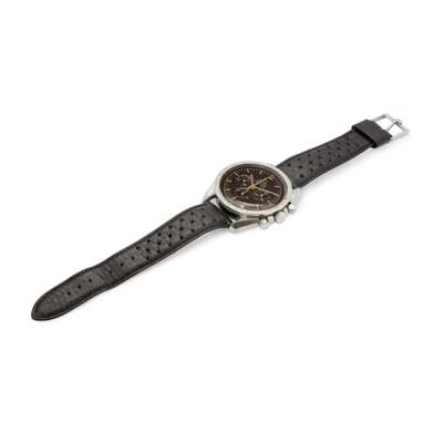 Cal.861 hand-wound movement, dark brown dial with tritium baton indexes, subsidiary dials for 30 minute & 12 hour chronograph registers, running seconds, white/tritium baton hands, stainless steel case with screw-down reverse with central Speedmaster motif, grey tachymeter bezel, on leather racing strap with steel Omega pin buckle.