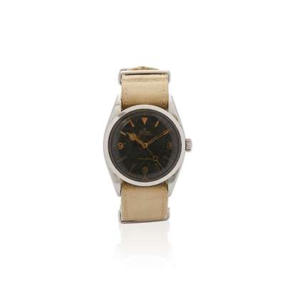 The Rolex reference 6150 was introduced in 1953 and famously tested by various Everest mountaineering expeditions over the coming years, including the successful summit by Sir Edmund Hillary and Tenzing Norgay of Mount Everest on May 29, 1953. Earlier the same year, on January 26th 1953, Rolex registered the name Explorer in Geneva. The example offered here, case number 930860 and stamped to the inner 1.53, is one of the earliest examples of the reference to feature the classic Explorer style black dial and, according to our research, the earliest such documented example to have appeared at auction.