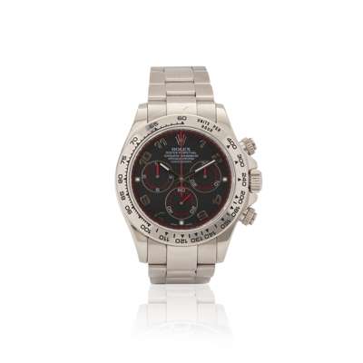 Cal.4130 self-winding movement, matt black ‘racing’ dial with applied white gold numerals, lower quarter luminous blocks, outer red minute track, subsidiary dials for 30 minute & 12 hour chronograph registers, running seconds, white gold/black/luminous baton hands, red chronograph seconds hands, sapphire crystal, 18k white gold Oyster case with screw-down reverse, Triplock crown and chronograph buttons, calibrated bezel, on fitted Rolex Oyster Ref.78499 18k white gold bracelet with locking clasp. Case, dial and movement signed.