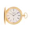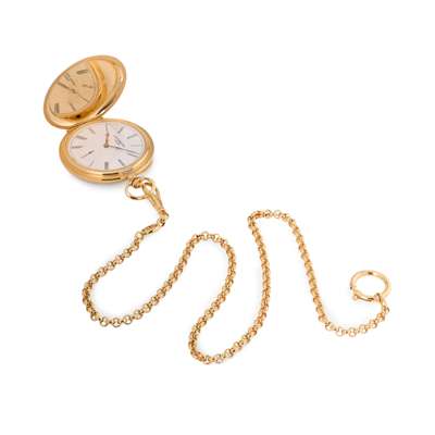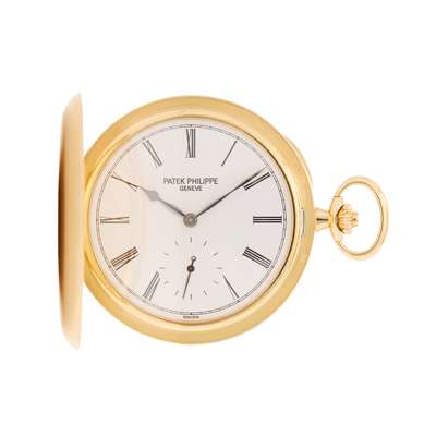 Cal.1-17/140 hand-wound mechanical 18 jewel movement adjusted to heat, cold, isochronism and five positions, overcoil hairspring, cam-type micro-regulation, PP seal, white dial black Roman numerals, outer minute track, subsidiary seconds, blackened hands, substantial hinged 18k gold hunter case, inner cover engraved with presentation inscription. Case, dial and movement signed. With 18k gold Patek Philippe belcher link chain.
