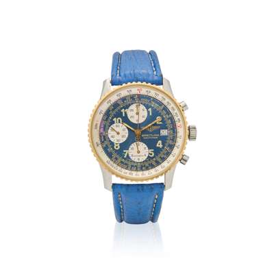 Self-winding movement, blued dial with tritium numerals, silvered subsidiary dials for 30 minute & 12 hour chronograph registers, running seconds, outer scales, date aperture, gilt tritium baton hands, stainless steel case with screw-down numbered reverse, central Breitling motif and outer temperature conversion scale, rotating gold calibrated bezel, on blue leather strap with stainless steel Breitling folding buckle. Case, dial and movement signed.